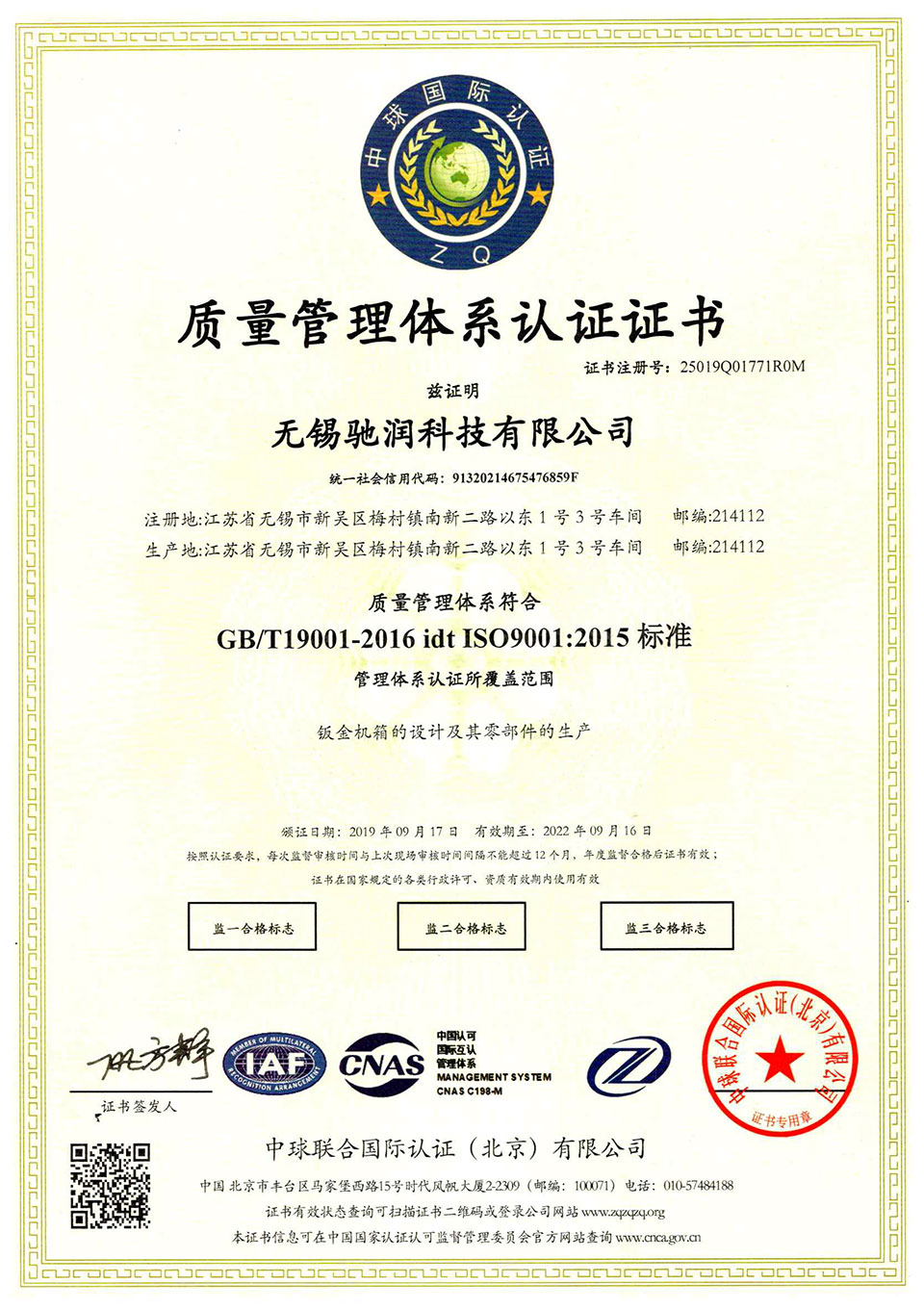 质量体系证书2019